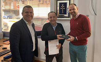 Miguel Ángel Ruiz, delegado comercial, y Fabián Acosta, delegado gestión, le hacen entrega de su merecido reconocimiento, agradeciéndole su trabajo y dedicación durante estos 30 años.