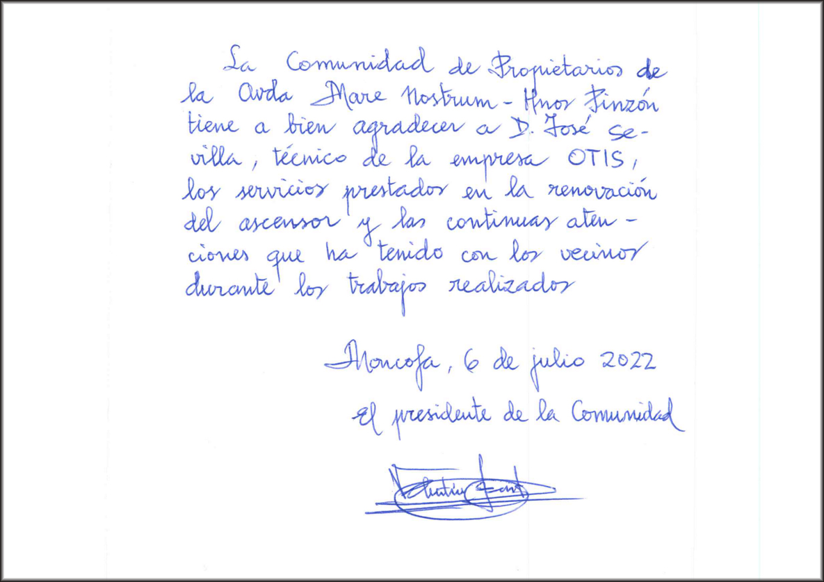 La comunidad de propietarios de la avenida Mare Nostrum con Hermanos Pinzón, de la localidad de Moncofa, en la provincia de Castellón, ha enviado una merecida nota manuscrita de felicitación a José Sevilla por las continuas atenciones que ha tenido con los vecinos durante los trabajos de modernización del ascensor. ¡Enhorabuena!