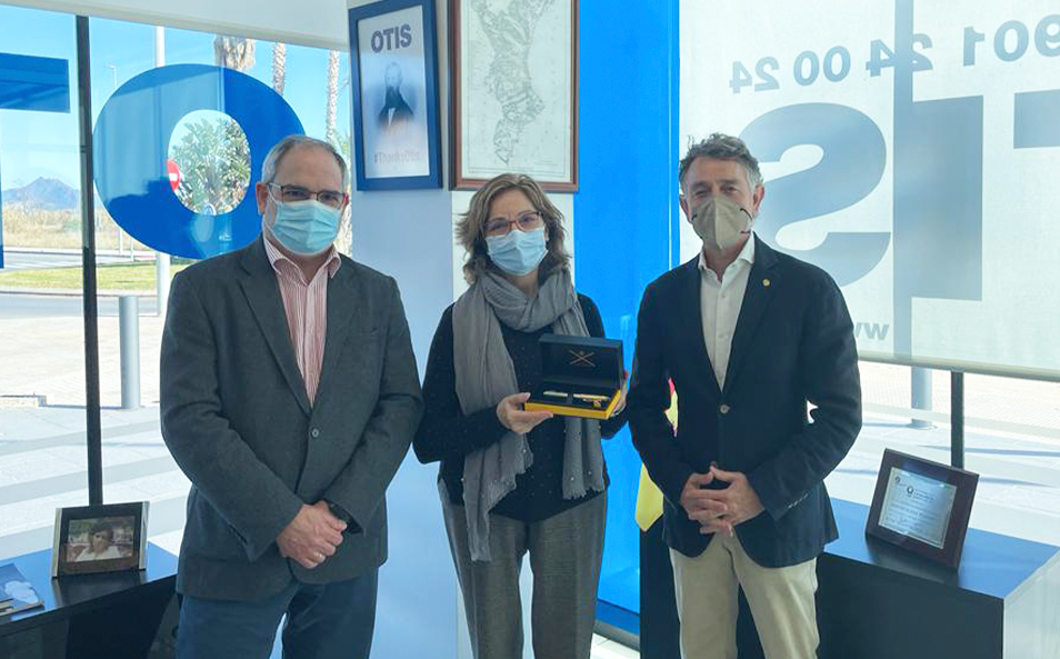 En la imagen, Javier Agudo, Director de Área Este (izquierda) y Paco Gil, Delegado de Castellón (derecha), hacen entrega del obsequio corporativo a la homenajeada (centro).