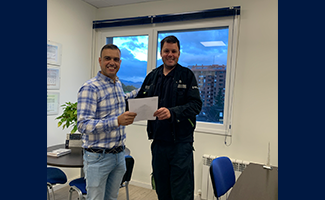 En la foto, su supervisor, Luis Miguel Menéndez Cueto, le hace entrega del escrito de felicitación.