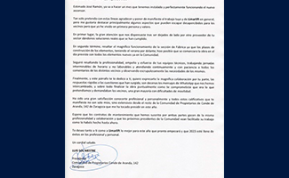 El delegado de Hemen Aragón, José Ramón Callejero Barrabés, ha recibido una carta de felicitación del presidente de la comunidad de propietarios Conde De Aranda 142 de Zaragoza, Luis Sol:
