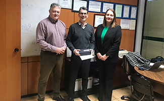 En la imagen, Miguel recibe el obsequio de la mano de su supervisor Juan Bernal y el delgado David reyes.
