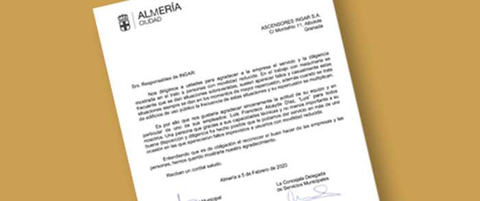 En la delegación de Ingar Almería se ha recibido esta carta de agradecimiento al técnico Luis Francisco Alcayde Díaz, por el buen servicio prestado al Ayuntamiento de Almería. Este organismo es un buen cliente de Ingar al que le mantenemos 97 unidades.