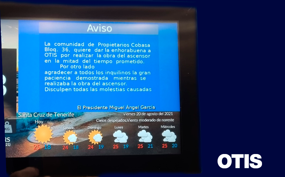 El presidente de la comunidad de propietarios de Cobasa 36 en Tenerife quiso felicitar a través de la pantalla e-View, en nombre de todos los vecinos, al equipo de Otis por el gran trabajo realizado en la modernización del ascensor del bloque, que concluyó en la mitad de tiempo previsto.