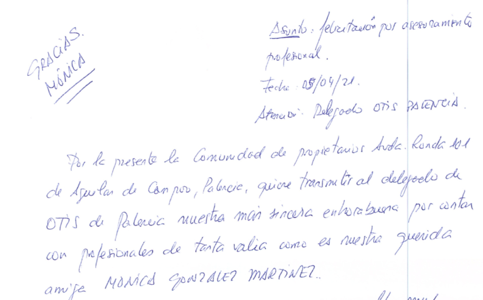 Hace algunos días, la delegación de Palencia recibió una carta dirigida a Mónica Gónzalez, comercial de la misma. Esta carta, remitida y escrita por el presidente de la C.P. de Avenida Ronda nº 101 de la localidad de Aguilar de Campoo, venía a felicitar y agradecer especialmente a Mónica por su asesoramiento y gestión de la instalación de un BEX Creación en ese edificio. El presidente de la comunidad de vecinos, en nombre de todos ellos, dirigió unas palabras al delegado en las que daba su más sincera enhorabuena por contar con profesionales de tanta valía como Mónica. “Cualquier instalación de un ascensor resulta muy compleja y en nuestra comunidad así fue. Sólo la orientación y atención personal de Mónica nos permitió avanzar y conseguir que se efectuara la obra de instalación. Nos sentimos felices y ella ha sido la responsable”, resalta el presidente en su carta.