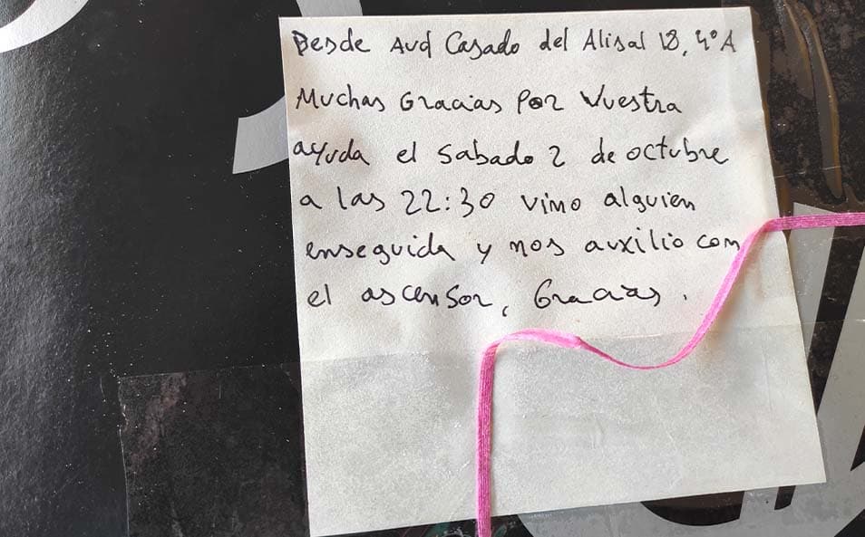 El sábado 2 de octubre de 2021 recibimos una llamada urgente por parte de unos clientes de Palencia muy asustados que informaban que su perro se había quedado atrapado en el ascensor y no sabían si se encontraba bien. Nuestro compañero Juan López, técnico de la comunidad, acudió a la mayor brevedad posible, preocupándose en todo momento por comprobar el estado del animal, tranquilizar a los dueños y proceder a su rescate.Tras un final feliz, el cliente quiso agradecer a Juan su rapidez y atención con unos pasteles y una nota de agradecimiento que se encargó de llevar presencialmente a la oficina. ¡Gracias por tu entrega, Juan!