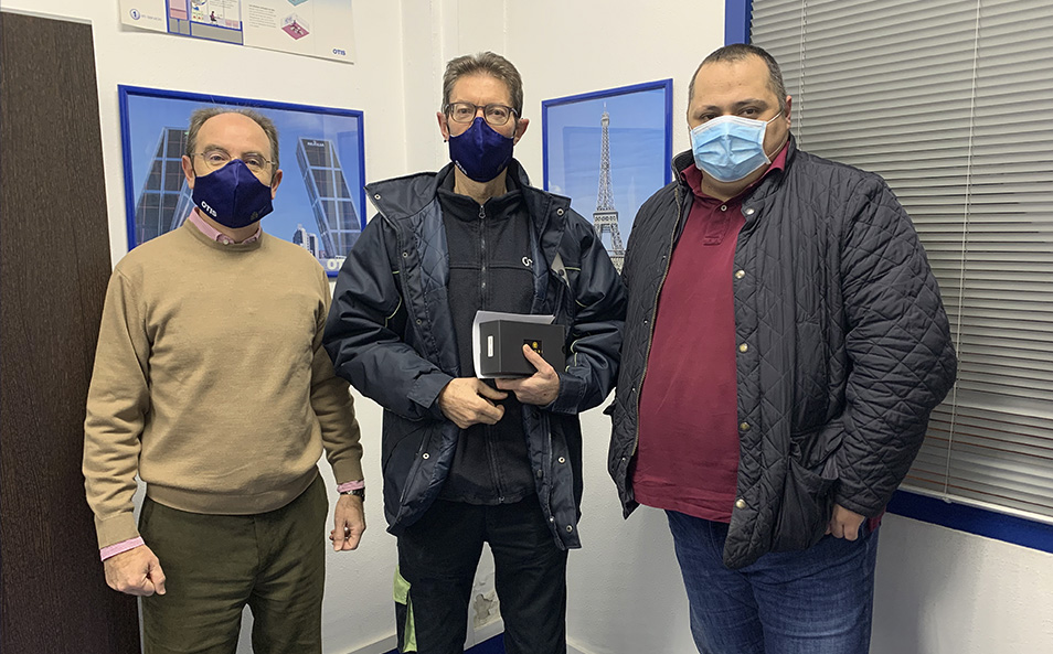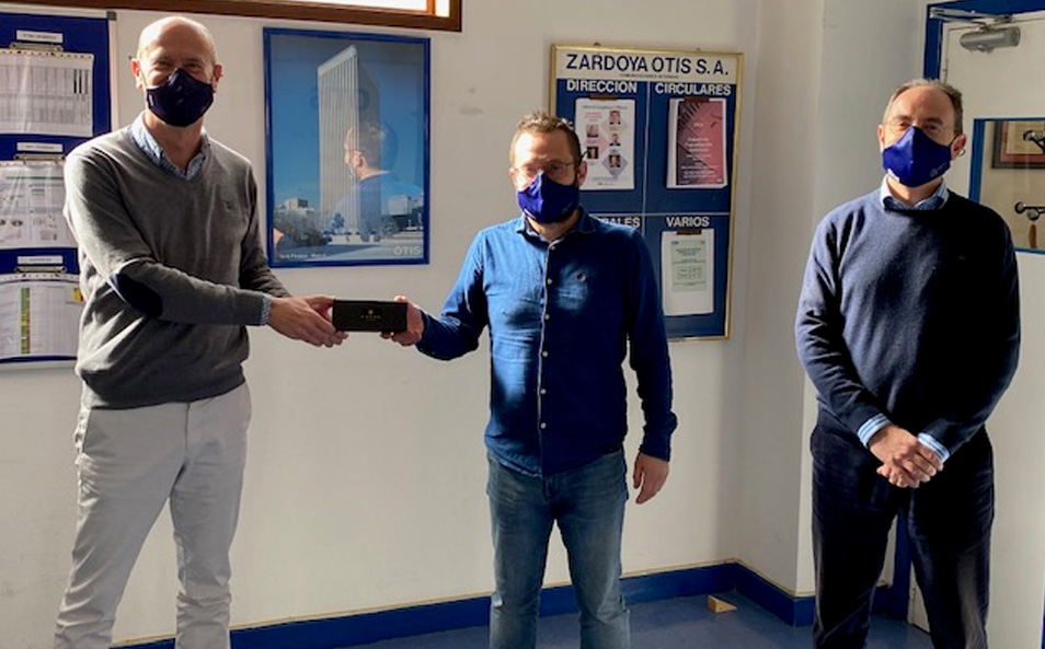 El técnico Manuel Gómez González, ha recibido de manos del delegado de la O.S. Deusto, Enrique Barranco, y de su supervisor, Aitor Moneo, el detalle conmemorativo por cumplir 35 años en Otis como técnico de mantenimiento. ¡Felicidades, Manuel!