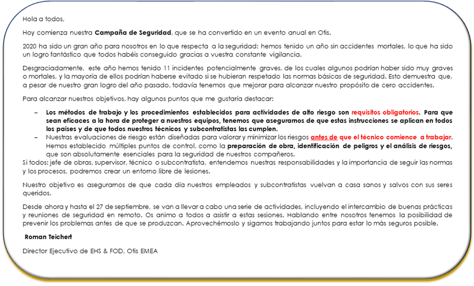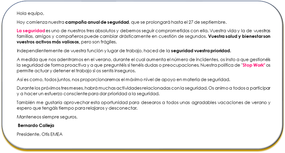 En el comunicado compartido con todos los empleados por la dirección de Seguridad, Bernardo Calleja, presidente de EMEA, resaltaba la importancia capital de seguir comprometidos con la Seguridad, uno de los tres absolutos de nuestra compañía y prioridad de todos los que formamos parte de Otis.