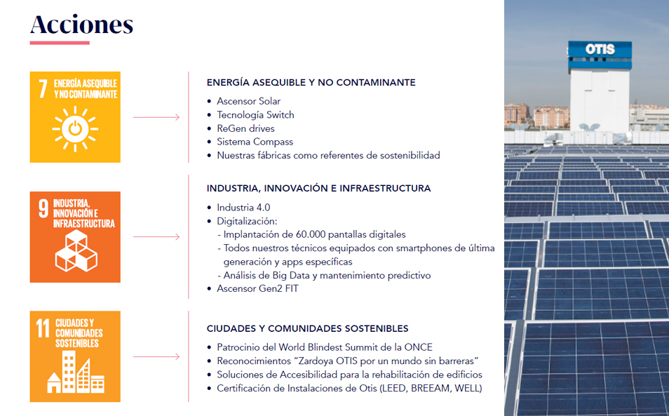 Así, los ascensores Otis van equipados de serie con sistemas de regeneración de energía que garantizan un mínimo consumo energético. Pensando en lograr un balance energético cero, la compañía ha desarrollado el ascensor solar, del que ya se han instalado más de 200 unidades y que abren el camino hacia una economía totalmente descarbonizada. Entre todos, toda la sociedad, hemos de conseguir incrementar el uso de las energías renovables a un 38% en 2021.